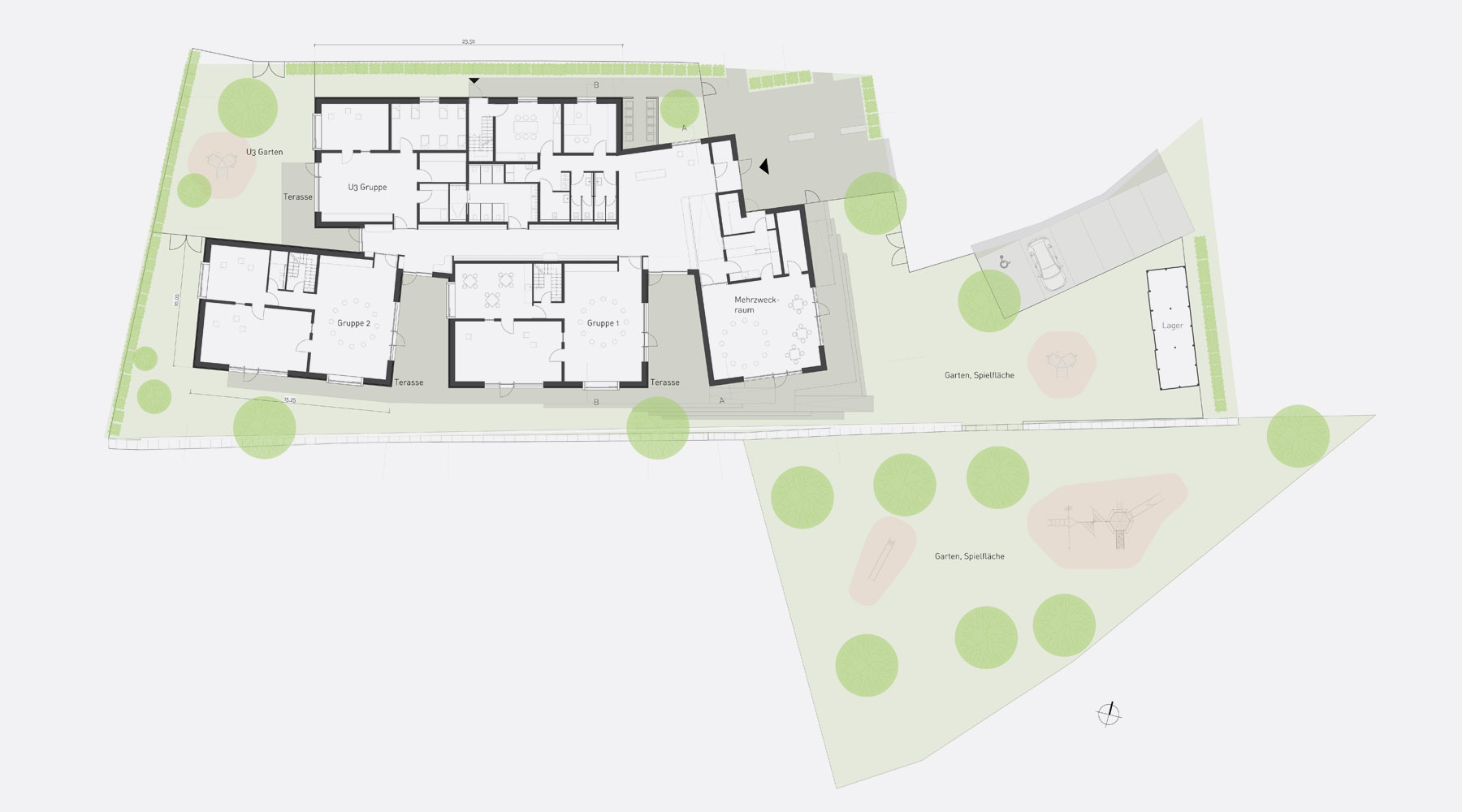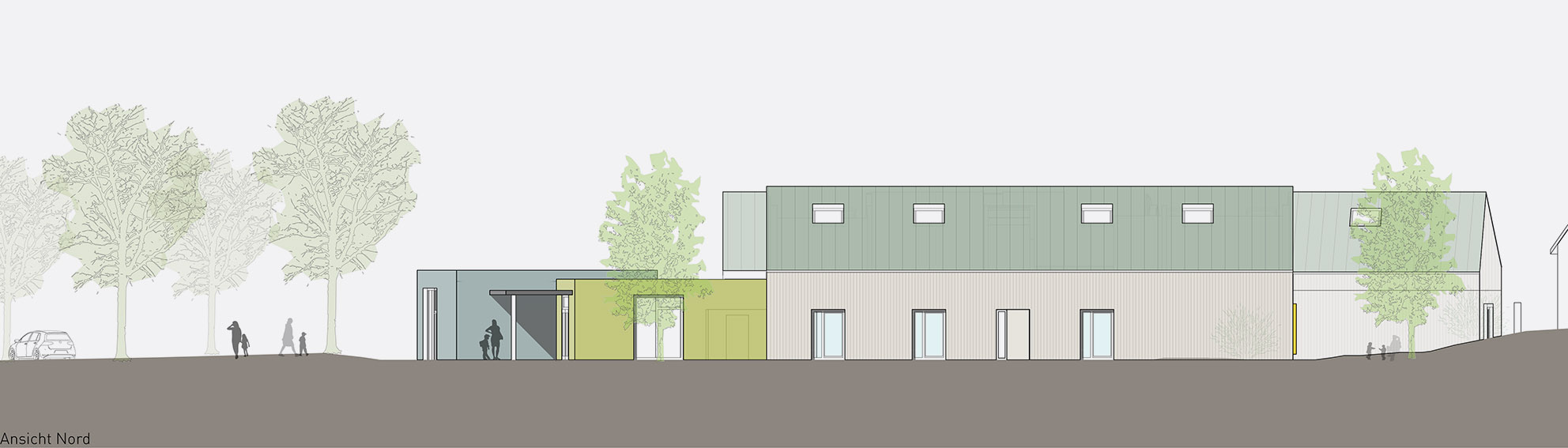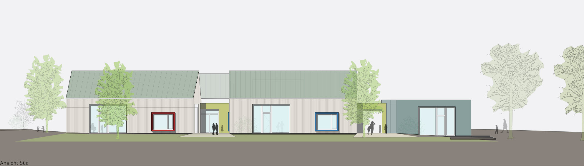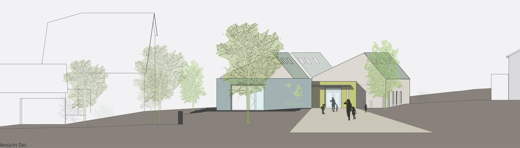 Kindergarten Vogelhäuschen Entwurf und Planung eines Kindergartens mit 3 Gruppen in Wiernsheim Iptingen.Klimafreundlicher Neubau mit Lebenszyklusanalyse. Fertigstellung: 2027Nutzfläche: 850 qmEnergiestandard: KFW 40 Bauherr: Gemeinde Wiernsheim